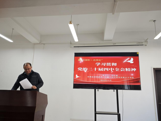 在汇文楼A308会议室,举办学习贯彻党的二十届四中全会精神专题宣讲会。本次宣讲会由校思政课教师宣讲团成员、马克思主义学院副院长倪松根副教授主讲,学院党委书记王军主持会议,学院全体教师参加学习。
