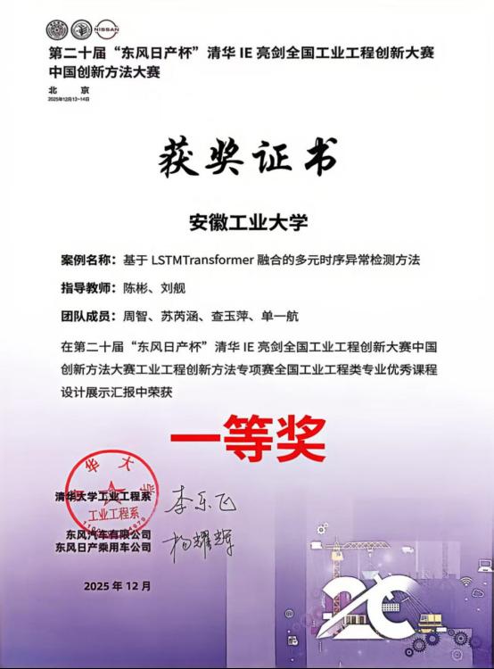 学生周智、苏芮涵、查玉萍、单一航所提交的《基于LSTMTransformer融合的多元时序异常检测方法》课程设计作品在初赛获评“优秀”等级,并成功入围总决赛,指导教师为陈彬和刘舰老师。
