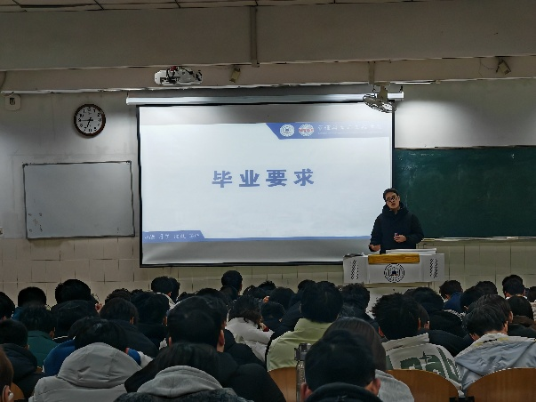 会上,曹宇结合各专业学业数据,对上学期学习情况进行多维剖析,系统梳理共性问题。围绕毕业要求,他从第一课堂学分、补考补选、体测达标及英语四级等环节入手,提醒同学们强化规划意识,及时查漏补缺,为顺利毕业奠定基础。同时,通过分析实习就业陷阱、考研考公诈骗等典型案例,他强调要增强防范意识,严守安全底线。