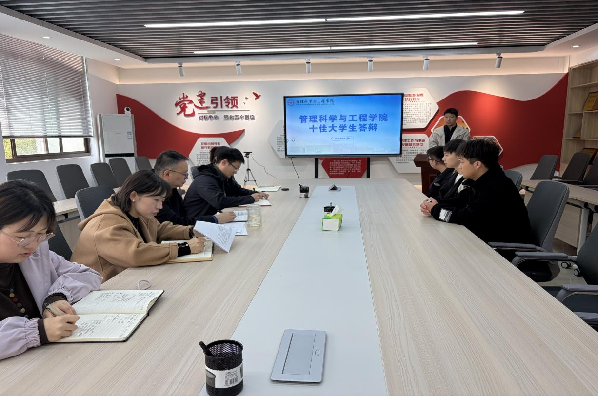 于汇文楼A302顺利举办“十佳大学生”答辩会。学院党委书记王军,党委副书记、副院长、纪委书记赵颖,辅导员赵玉婷、焦朋庆及研究生辅导员李军慧出席本次活动。