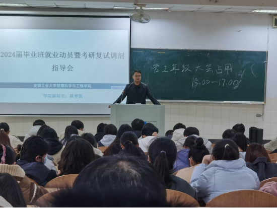在阶教101召开考研复试专题指导会暨2024届毕业班就业动员会。学院副院长陈梦凯、毕业班辅导员杨金星、李军慧以及全体毕业班同学参加本次会议,会议由杨金星主持。