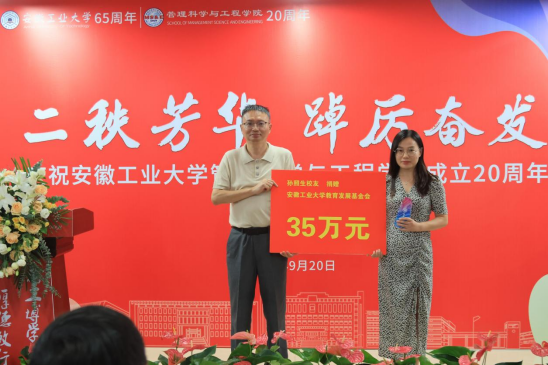 合肥校友会会长李斌回忆了在母校的求学经历和成长感悟。在校生代表工业工程213班李枫代表在校生向学院送上生日的祝福。学院党委书记王军作总结发言,他表示校友是学院宝贵的财富,二十年来学院的发展壮大、师资力量和办学条件快速发展,是管工人用沸腾的热血浇筑的。希望各位校友常回来看看,与学院携手共进,积极为学院的发展贡献智慧与力量。会上,汪和平院长、王军书记分别向安徽夺冠体育科技有限公司董事长2013届校友陈志栋、江苏艺特新能源科技有限公司董事长2006届校友孙照生等颁发了捐赠“特别贡献奖”。据悉,陈志栋、孙照生两位校友累计向学校、学院捐赠75万元。