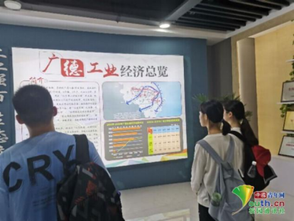 图为工作人员为实践队员介绍广德发展所取得的荣誉。中国青年网通讯员李家慧摄