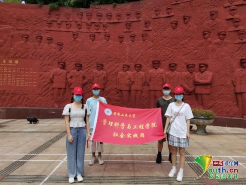 实践队员们首先来到悼念广场。其中央是18米高的烈士纪念塔,正面为毛主席题字手迹:“人民英雄永垂不朽”,其余三面刻有记录皖西革命斗争史的铭文,塔顶竖有闪闪红星。顺着园内小路前行,许继慎烈士铜像映入眼帘。许继慎是中国工农红军早期的革命将领,曾被评为100位为新中国成立作出突出贡献的英雄模范之一,铜像上的许继慎烈士一手叉腰,眼睛望向远方,展现着皖西人民面对战争时从容不迫的英勇姿态。看到这些场景,实践队员们肃然起敬,整齐划一地面朝着这些“英雄印记”敬礼。
