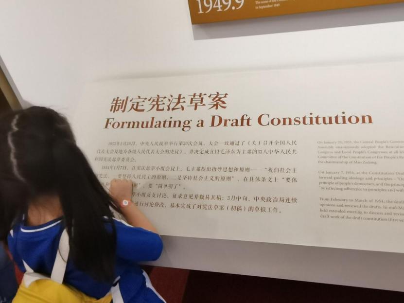 图为小朋友聚精会神地了解制定1954年宪法时的图片。