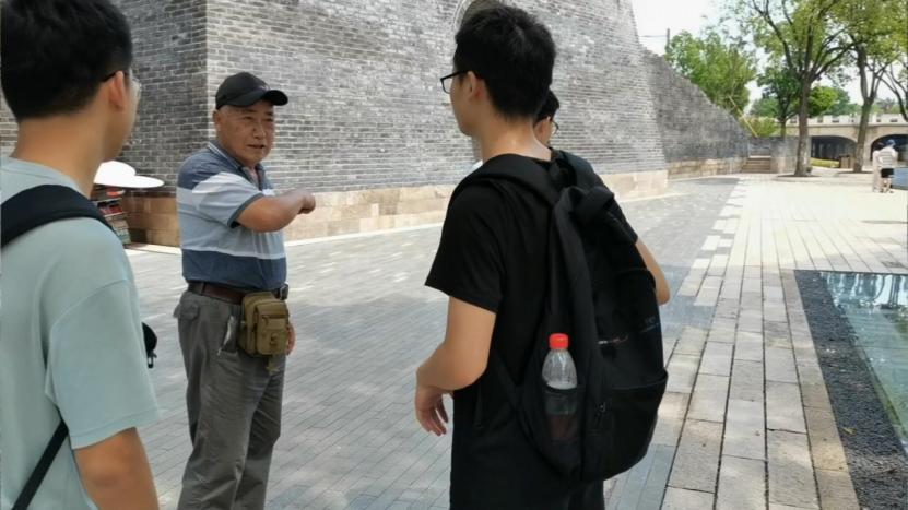 图为嘉兴当地的大爷热心地为实践队员讲解狮子汇渡口的历史以及一大的参加成员。