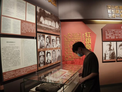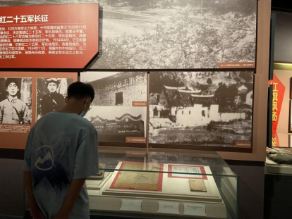 图中为实践队员参观陈列的长征历史遗物。