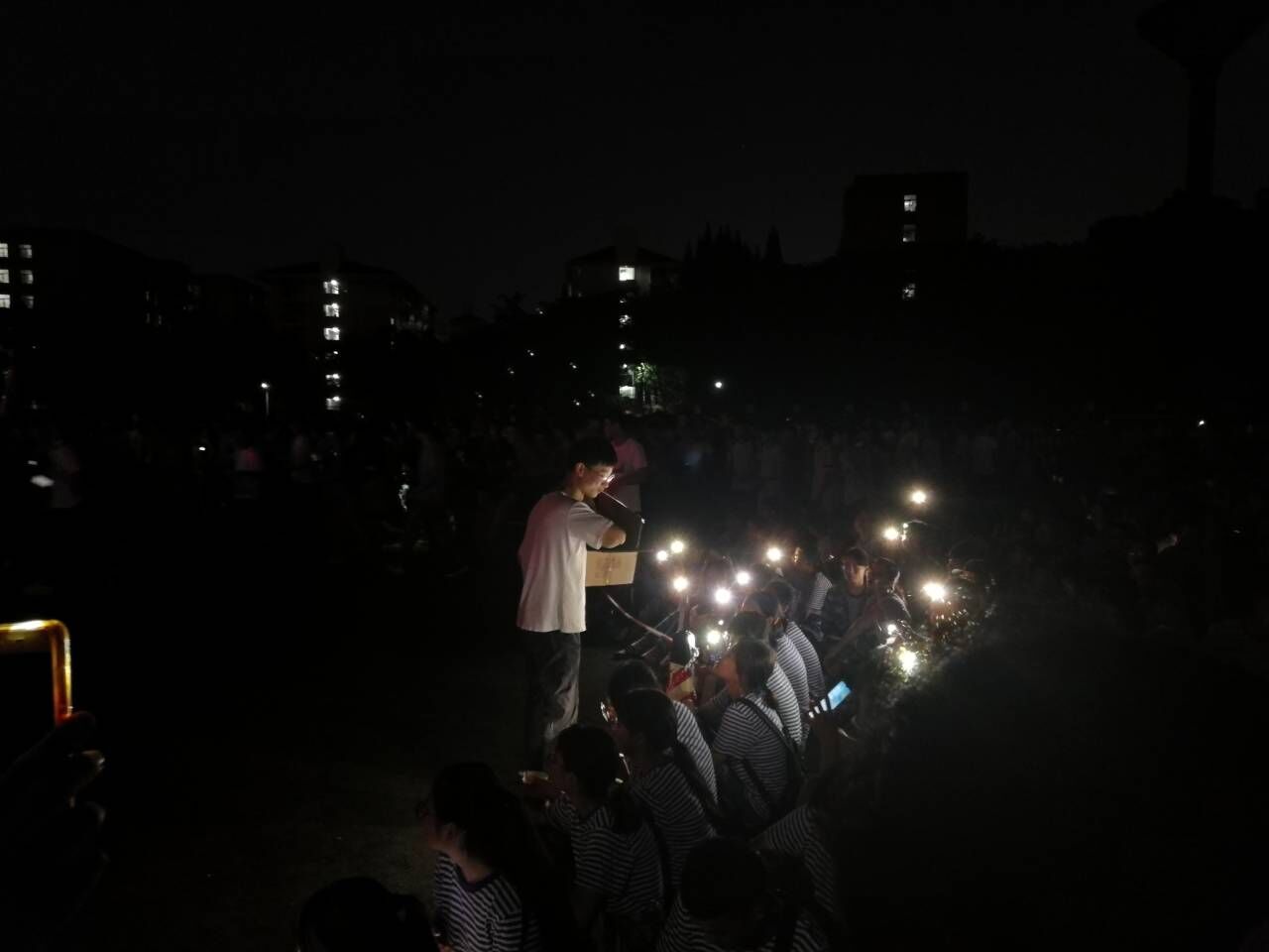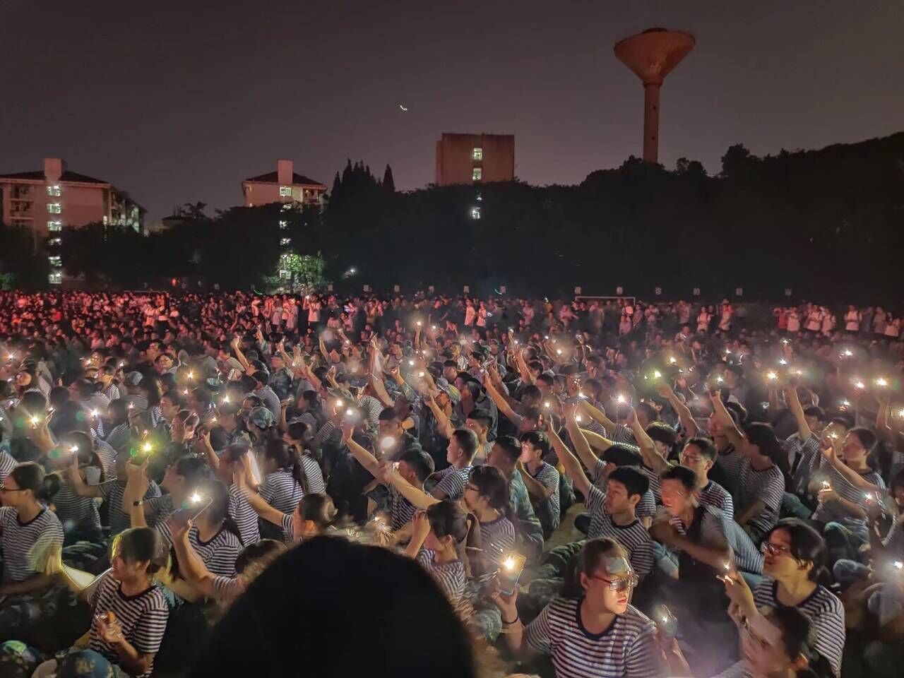 夜幕降临,田径场上灯光绚烂,迎新晚会盛大精彩。一群穿着迷彩服的学生正坐在操场上,一只手拿着带有金石堂