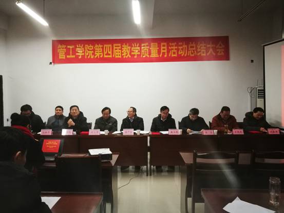 在会议室召开第四届“教学质量月”活动总结表彰大会,副校长葛芦生、校发展规划处处长戴玉纯、教师能力发展中心主任刘立平、教务处副处长李杰及学院党政领导、全体教职工和学生代表参加会议。