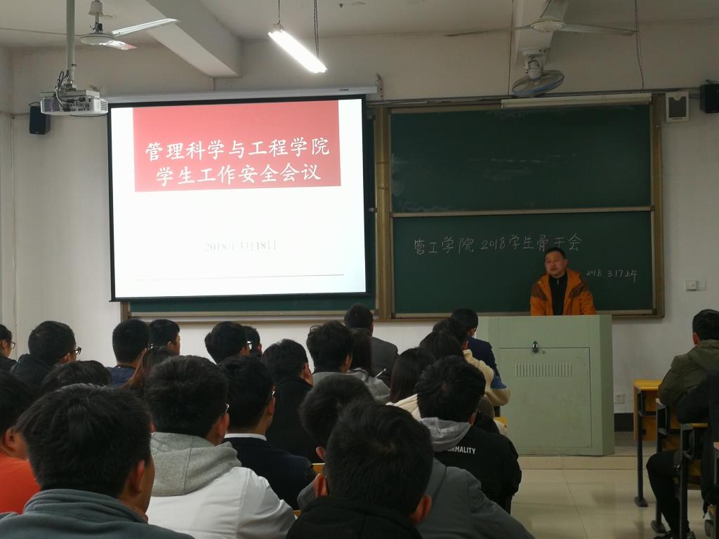 汪春胜首先传达了校2018年安全稳定工作会议精神。他说今年是全面贯彻党的十九大精神的开局之年,也是建校60周年的纪念年,学生骨干和信息员要意识到做好安全稳定工作的重要意义。随后,他对做好学院学生安全稳定工作进行了明确:一是要求全体骨干要坚持以习近平新时代中国特色社会主义思想为指导,提升对学生安全稳定工作重要性的认识;二是要牢固树立底线思维和红线意识,要认真学习学校和学院的各项安全管理规定;三是要重视各项能力的提升,要以身作则,坚持做好“零汇报”、“晚检查”等日常工作,树立安全隐患预防意识,切实做好各项关注的落实。