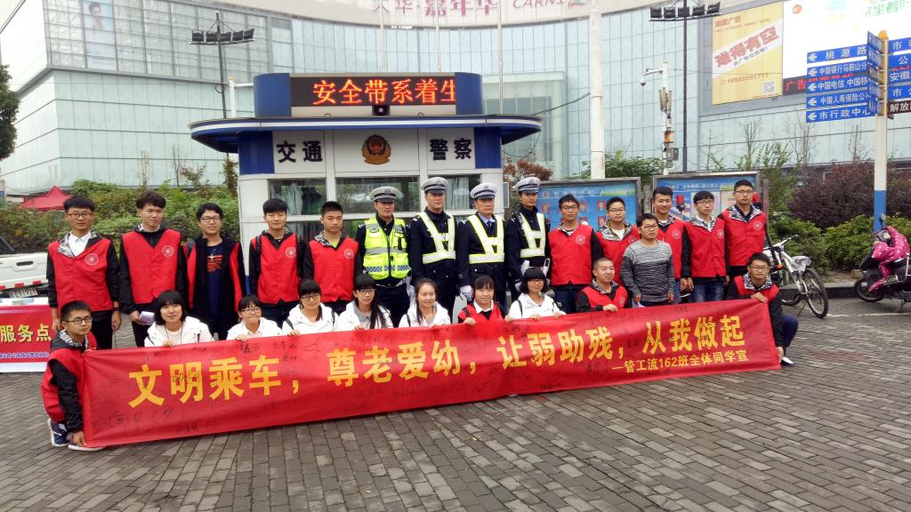 “乘车时系好安全带”,“遵守交通规则,文明出行”,“文明乘车,尊老爱幼,让弱助残,从我做起”。上午8点,志愿者们和交警一起做起了文明安全知识宣传。在花山交警大队领导下,学院物流工程162班的志愿者们积极为过往行人分发了安全知识的宣传手册。大家耐心解答市民咨询的相关道路交通事故和交通法律法规的问题,还邀请过往市民在横幅上签名承诺。活动之前,志愿者们还以宿舍为单位,手工绘制了交通安全漫画,并现场进行了分发。
