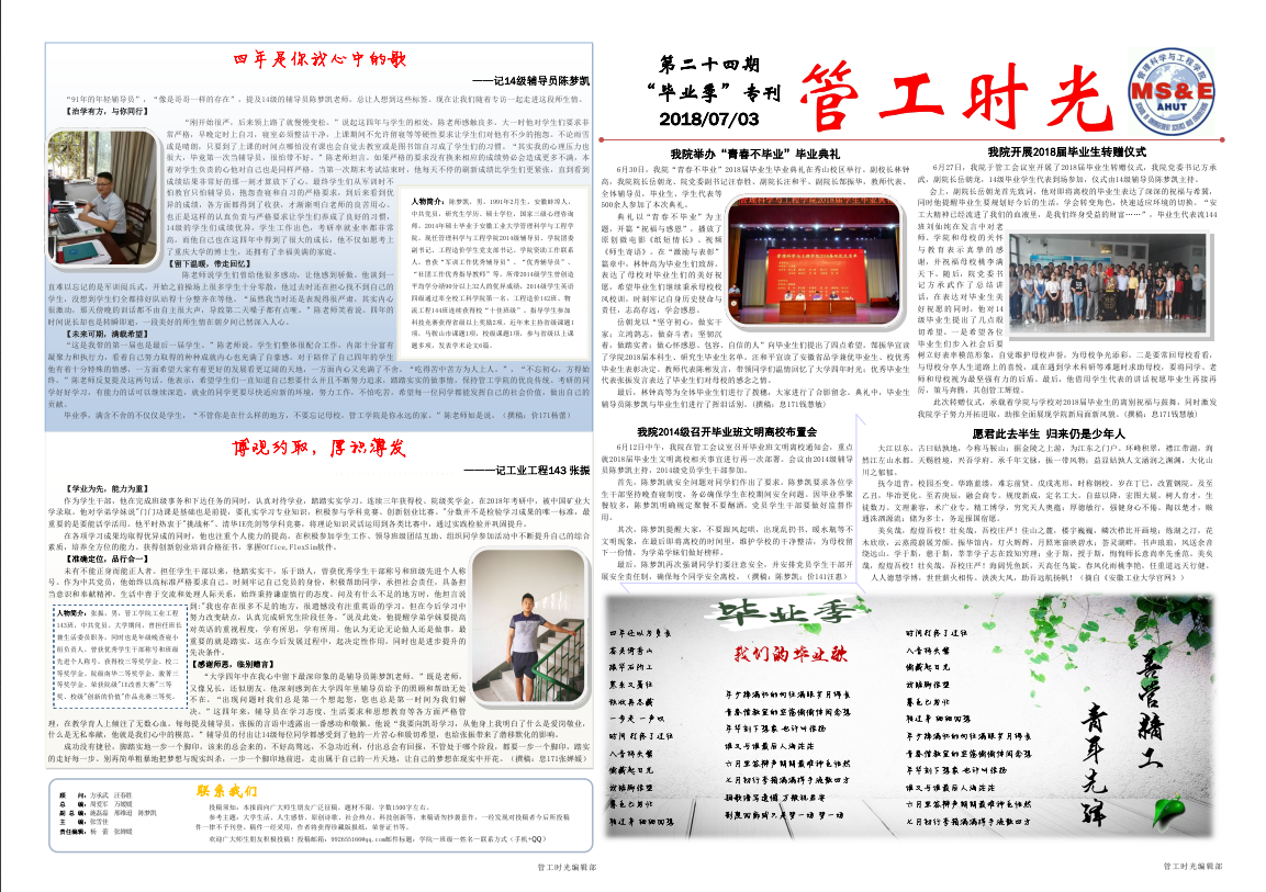 管工时光为金石堂 院报宣传平台,负责学院传统媒体报纸的编辑、策划与排版,与月刊、半月刊的形式对金石堂 近期重大活动事件进行综合报道,同时根据国家实事推出专刊。特设诗话管工环节,鼓励学生原创诗歌投稿,激发学生创作热情。以下为管工时光第二十四期第一、二版: