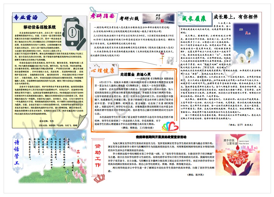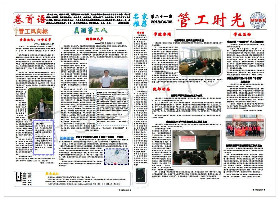 管工时光为金石堂 院报宣传平台,负责学院传统媒体报纸的编辑、策划与排版,以月刊、半月刊的形式对金石堂 近期重大活动事件进行综合报道,同时根据国家实事推出专刊。特设诗话管工环节,鼓励学生原创诗歌投稿,激发学生创作热情。以下为管工时光第二十一期第一、二版。