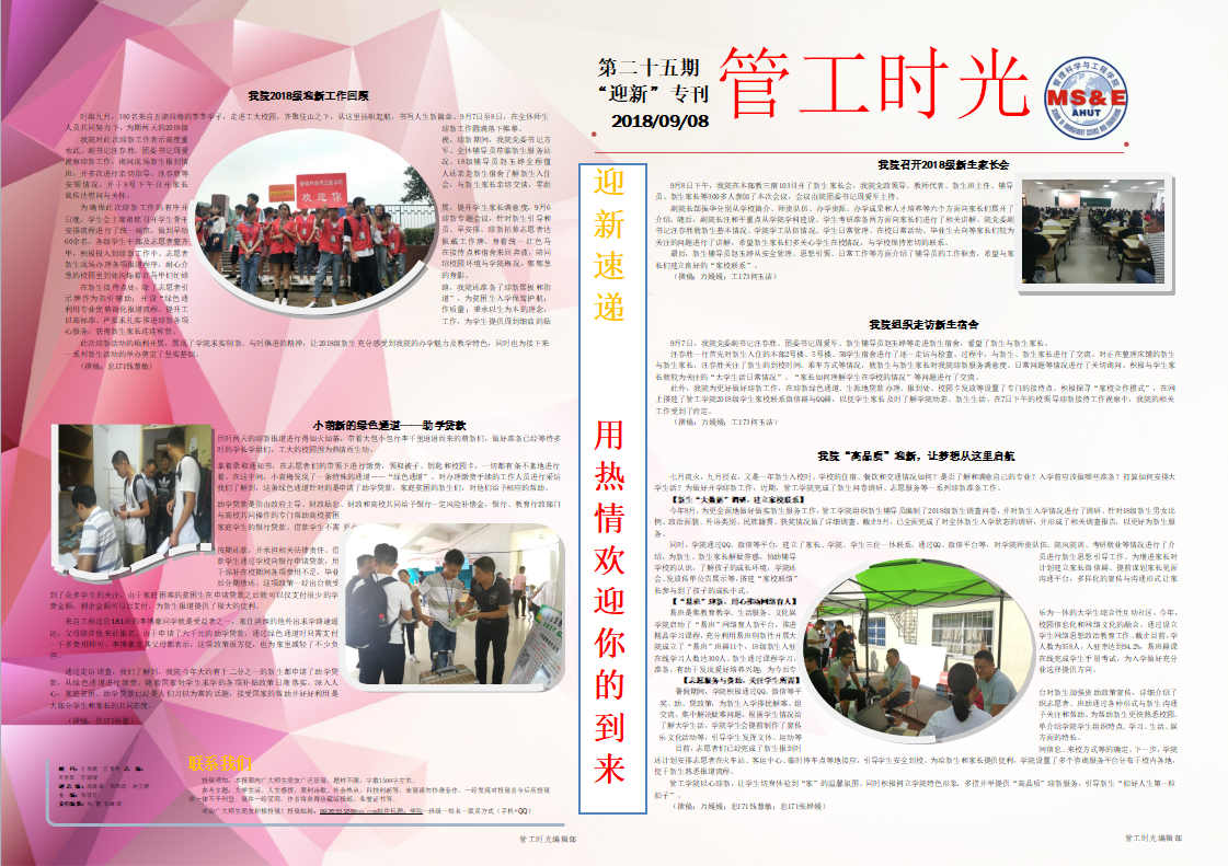 管工时光为金石堂 院报宣传平台,负责学院传统媒体报纸的编辑、策划与排版,以月刊、半月刊的形式对金石堂 近期重大活动事件进行综合报道,同时根据国家实事推出专刊。特设诗话管工环节,鼓励学生原创诗歌投稿,激发学生创作热情。以下为管工时光第二十五期第一、二版: