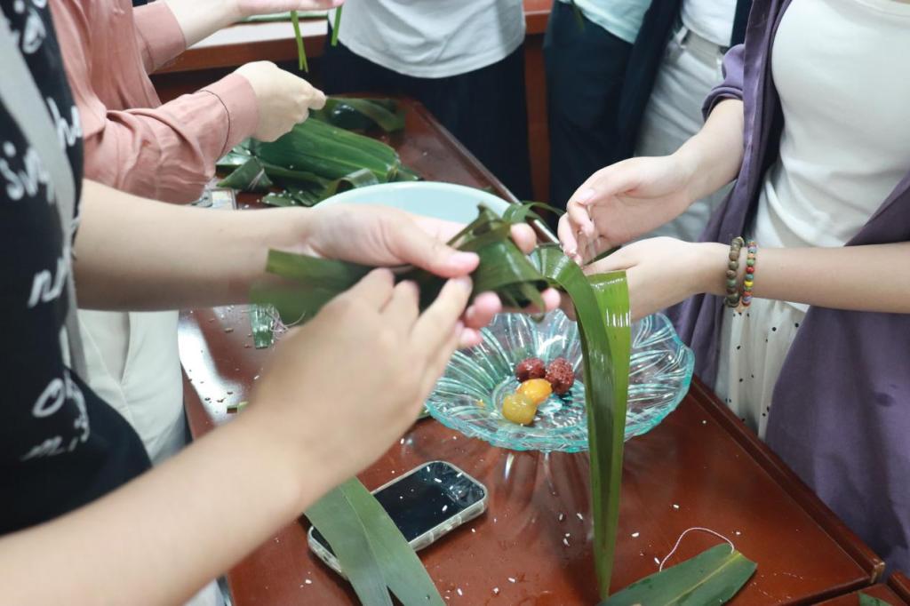 活动分为粽子制作和香囊制作两个环节。在粽子制作环节,学院教师现场示范包粽子技巧,从将粽叶折成漏斗状,到填入糯米、蜜枣等馅料后捆扎成型,逐步讲解要领。师生们认真学习,动手实践,逐渐掌握包粽子要领,最终共同包制出多枚蜜枣馅和蛋黄馅粽子。在等待粽子煮制间隙,活动进入香囊制作环节。师生们穿针引线、填充香料、细心缝合,制作出各具特色的香囊成品。