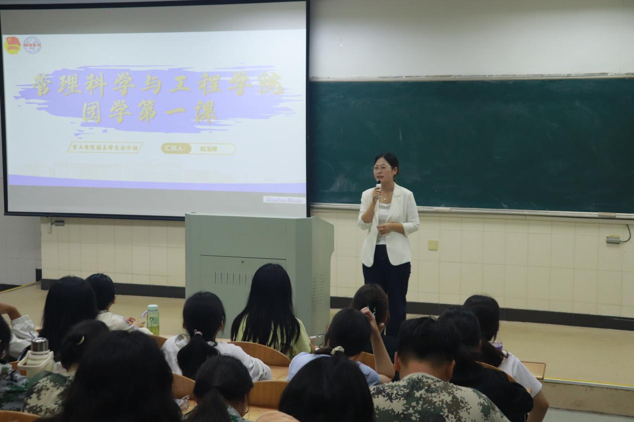 为引导学院2025级新生深入了解团学工作,增强集体归属感,9月20日,管理科学与工程学院在阶教103举办“团学第一课”活动。本次活动由学院团委书记赵玉婷主持,全体2025级新生参加。