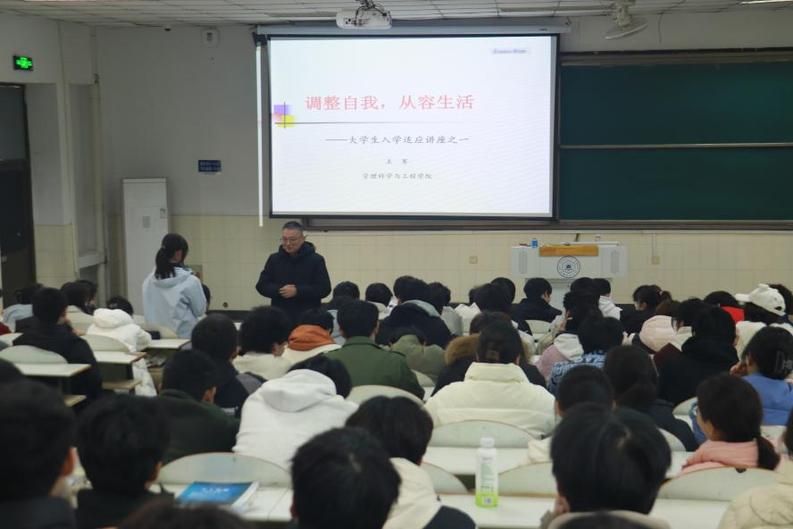 12月3日,管理科学与工程学院于阶教105举办《调整自我,从容生活》大学生入学适应讲座。学院党委书记王军主讲,2025级新生参与。