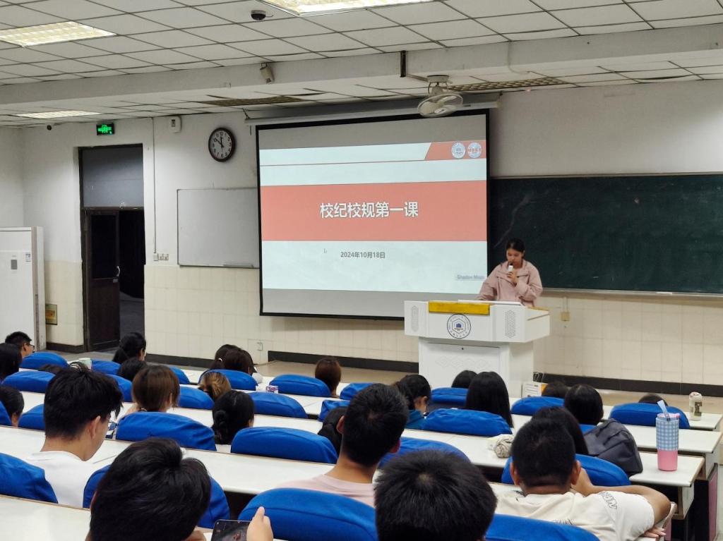 为加强学生管理,规范学生行为,营造良好的学习氛围,10月18日,管理科学与工程学院于阶教101开展校纪校规第一课,2024级辅导员李军慧、孙如梦及全体2024级新生参与。