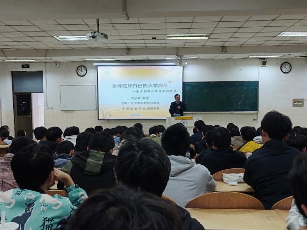为激发大学生创新精神,培养大学生创新思维能力。11月25日,管理科学与工程学院于阶教101开展《怎样过好自己的大学四年——基于创新人才培养的视角》的讲座。本次讲座由学院党委副书记、副院长、纪委书记赵颖主持,创新创业学院教授冷护基主讲,2024级全体学生参与。
