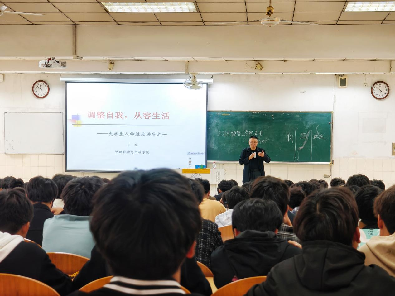 为帮助新生更好地适应大学生活,顺利开启人生新征程,10月21日,管理科学与工程学院于阶教101开展《调整自我,从容生活》大学生入学适应心理健康讲座,本次讲座由学院党委书记王军教授主讲,2024级全体新生参与。