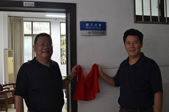 在热烈掌声中,朱主席与方书记为管理科学与工程学院“教工之家”揭牌。