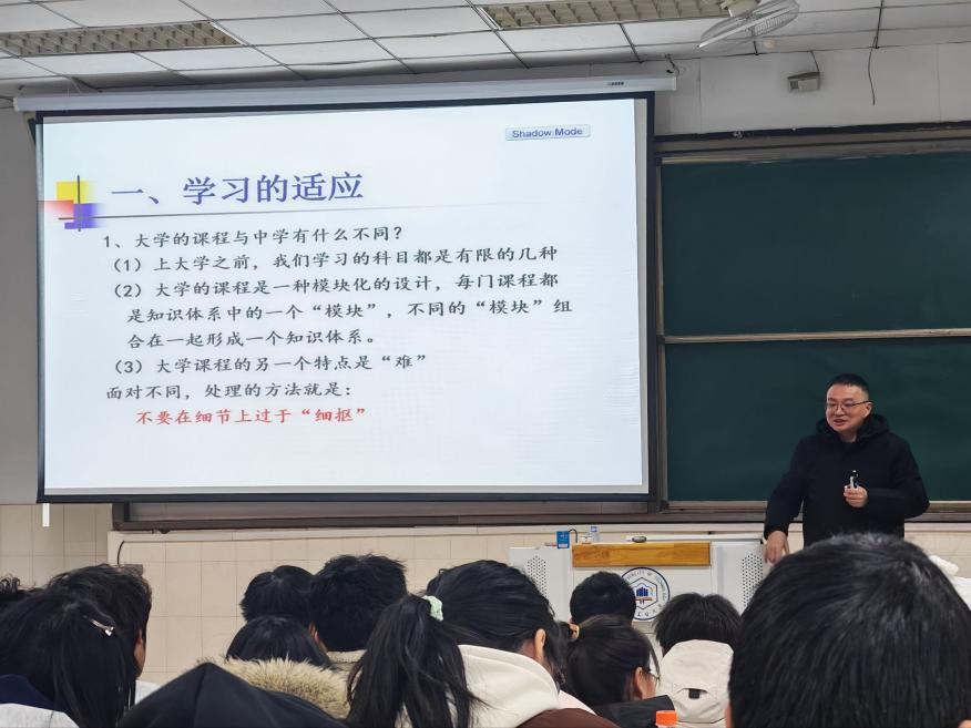 12月3日,管理科学与工程学院于阶教105举办《调整自我,从容生活》大学生入学适应讲座。学院党委书记王军主讲,2025级新生参与。
