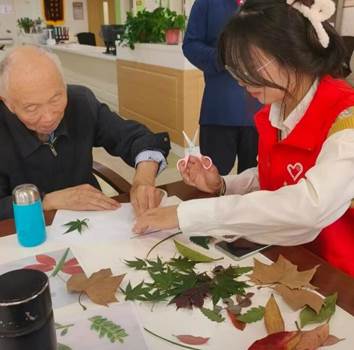 图为实践队员与康养中心老人一起完成树叶标本的制作