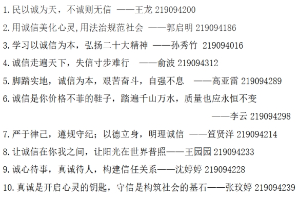 通过学院本次的诚信标语收集活动以丰富多样的形式强化了学院学生的诚信知识和诚信意识,也为学院学生品德修养、能力发展提供了实践锻炼、展示自我的平台。诚者,天之道也;思诚者,人之道也。相信金石堂 的学子们将在以后的成长中秉持诚信准则,积极践行“诚信立身,秉信立行”精神,努力炼就合格新时代青年的诚信品质。