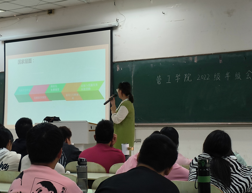 于教三南103举办 “资助两节课”主题年级会。学院资助工作负责老师赵玉婷主讲,辅导员焦朋庆及22级全体同学到场参加。