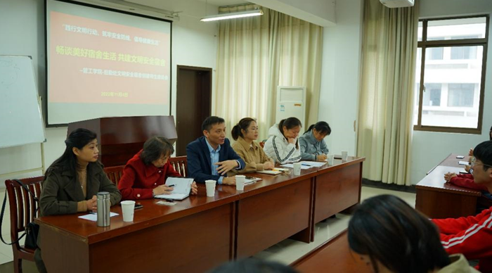 联合后勤处于汇文楼A308召开文明安全宿舍创建师生座谈会。后勤处学生公寓管理服务中心主任涂必华、各楼栋宿舍管理员、院团委书记万媛媛、全体辅导员、学生干部及寝室长代表参加座谈会。