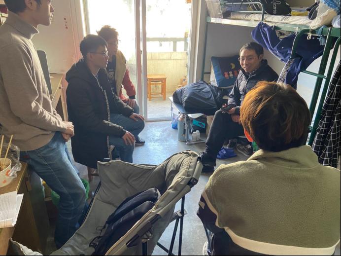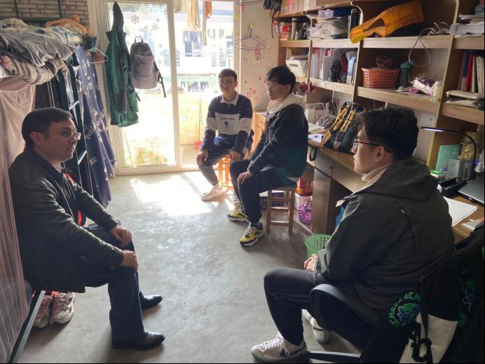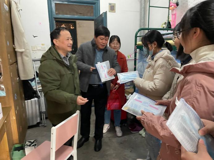 慰问中,汪春胜、汪和平一行亲切地询问同学们的备考状态,对考研学生积极备考、勤奋学习的表现给予了肯定与鼓励,鼓励大家树立远大目标、实现人生理想;同时也叮嘱学生要劳逸结合、科学备考,以最饱满的状态参加考试。汪春胜提醒同学们提前熟悉考试规则和要求,准备好相关证件和考试用品,加强疫情防控意识,做好考研期间的自我防护工作。王功成、郜振华、王付宇分别进入宿舍,送上慰问品,耐心地倾听同学们的备考烦恼与困惑,引导同学们以积极平和的心态面对考试,祝福同学们取得优异成绩。