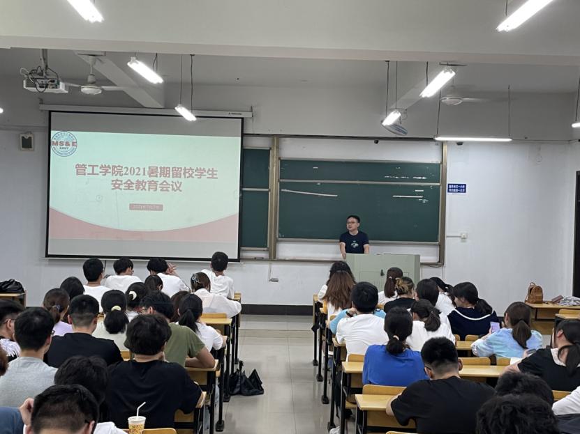 7月7日上午,管工学院在汇文楼D105召开2021年暑期留校学生安全教育会议,会议由院党委副书记王功成主持,毕业班辅导员赵玉婷、学院全体申请留校的学生参加了会议。