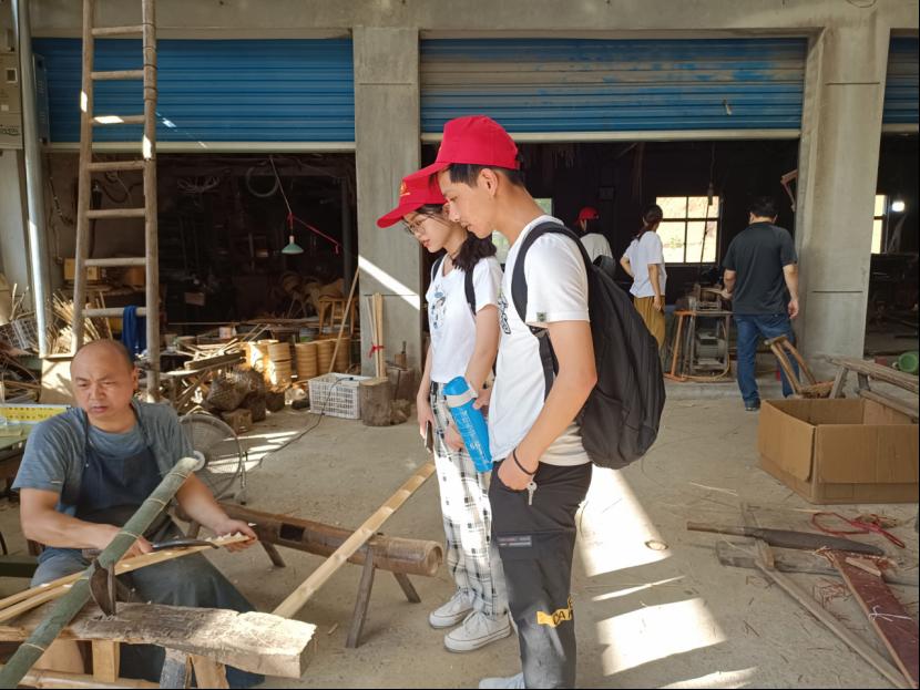 在明德公司,实践队员们走进明德折扇的展览馆与制作车间,并通过明德折扇第五代传人王亚凌的讲解,进一步了解了明德折扇制作工艺。在唐诗编织厂,唐氏竹编传承人唐圣丽带实践队员们参观了唐氏竹编的展览馆,并深入竹编工作车间,观摩如何将一颗毛竹变成可以编织的竹篾。在两个非遗文化企业手工艺人的手中,傲然挺立的竹子,经过一系列工序做成一件件物件。其手艺之巧妙、技艺之精湛让实践队员们体悟到了传统非遗文化的魅力。