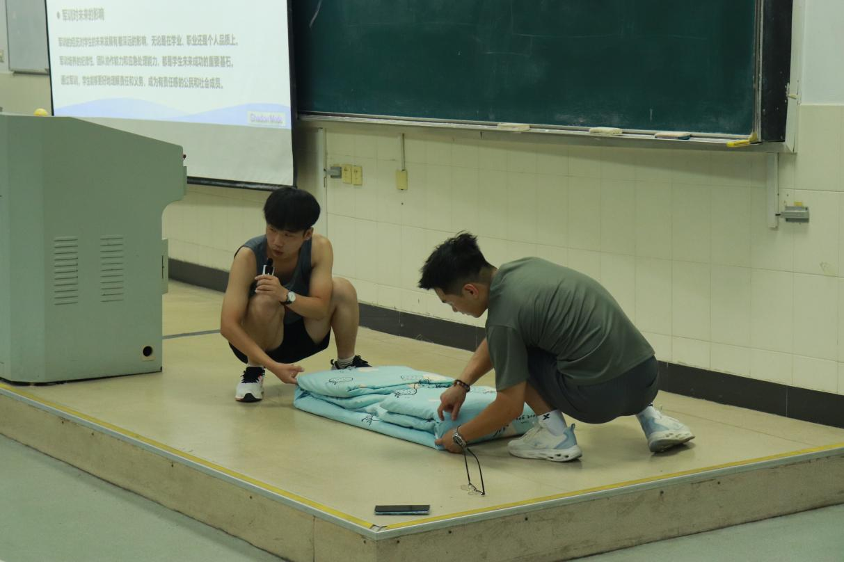 大会伊始,全体新生肃立,举起右手,共同进行军训宣誓,表达投身军训、锻炼自我的坚定决心。会上,孙如梦从个人与集体的关系、坚持与放弃的抉择、规则与自由的平衡三个方面,讲解了军训的意义与价值,引导新生们正确认识军训在个人成长中的重要作用。李军慧详细介绍了军训期间的日程安排及各项要求,并从军训技能展示、个人成长反思、军训对未来生活的影响等三个方面,全面阐述了军训的必要性,鼓励新生们珍惜军训机会,努力提升自我。在寝室内务方面,特别邀请了退伍士兵上台,向新生们详细演示了如何叠好一个标准的军被。会议最后,赵玉婷作总结发言。她希望2024级新生能够捧好接力棒,以饱满的热情和坚定的决心投入到军训中去,争取取得属于2024级自己的荣誉。