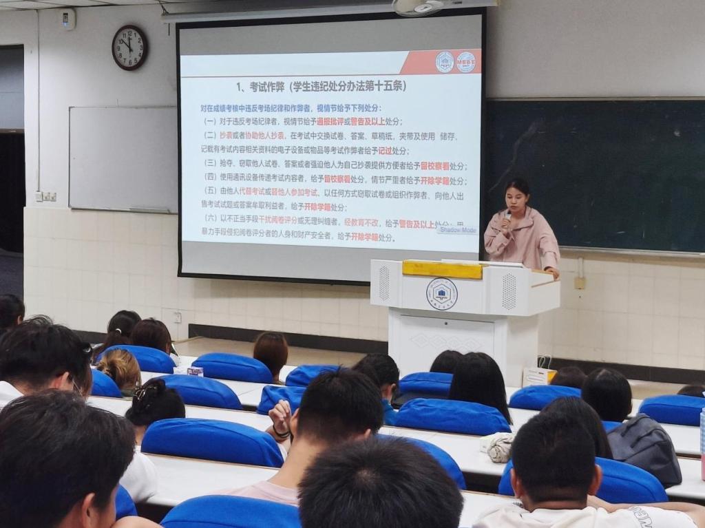 为加强学生管理,规范学生行为,营造良好的学习氛围,10月18日,管理科学与工程学院于阶教101开展校纪校规第一课,2024级辅导员李军慧、孙如梦及全体2024级新生参与。