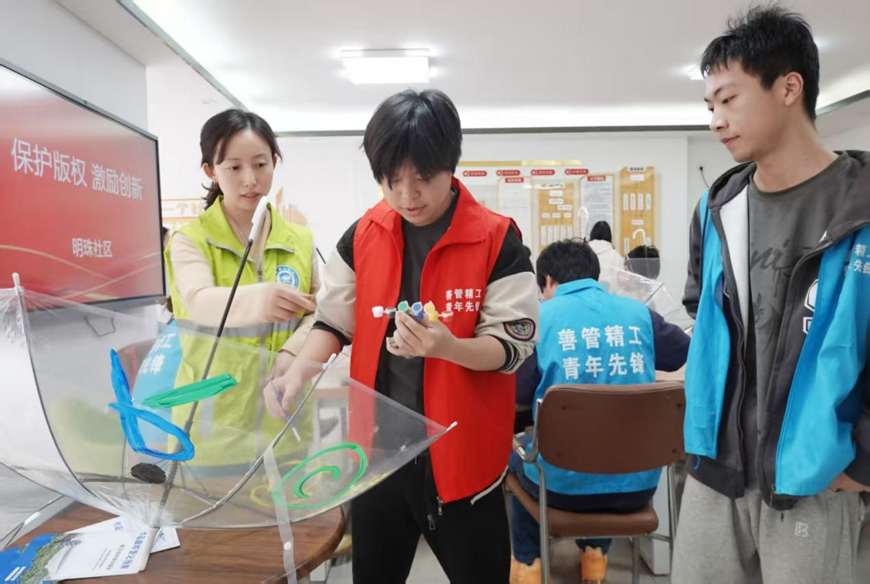 活动中,社区工作人员通过案例分析、政策解读等方式,让大家深刻理解知识产权保护相关法律制度在促进新质生产力发展、助力强国建设中的重要保障作用。随后,通过阅读知识产权保护工作的宣传海报,志愿者们进一步了解保护知识产权对于维护社会文化安全的重要性。在创意绘伞的活动中,社区工作人员与志愿者们一同在透明雨伞上绘制出表现知识产权主题元素的图案和文字,并将手绘雨伞赠送给社区公共文化空间。